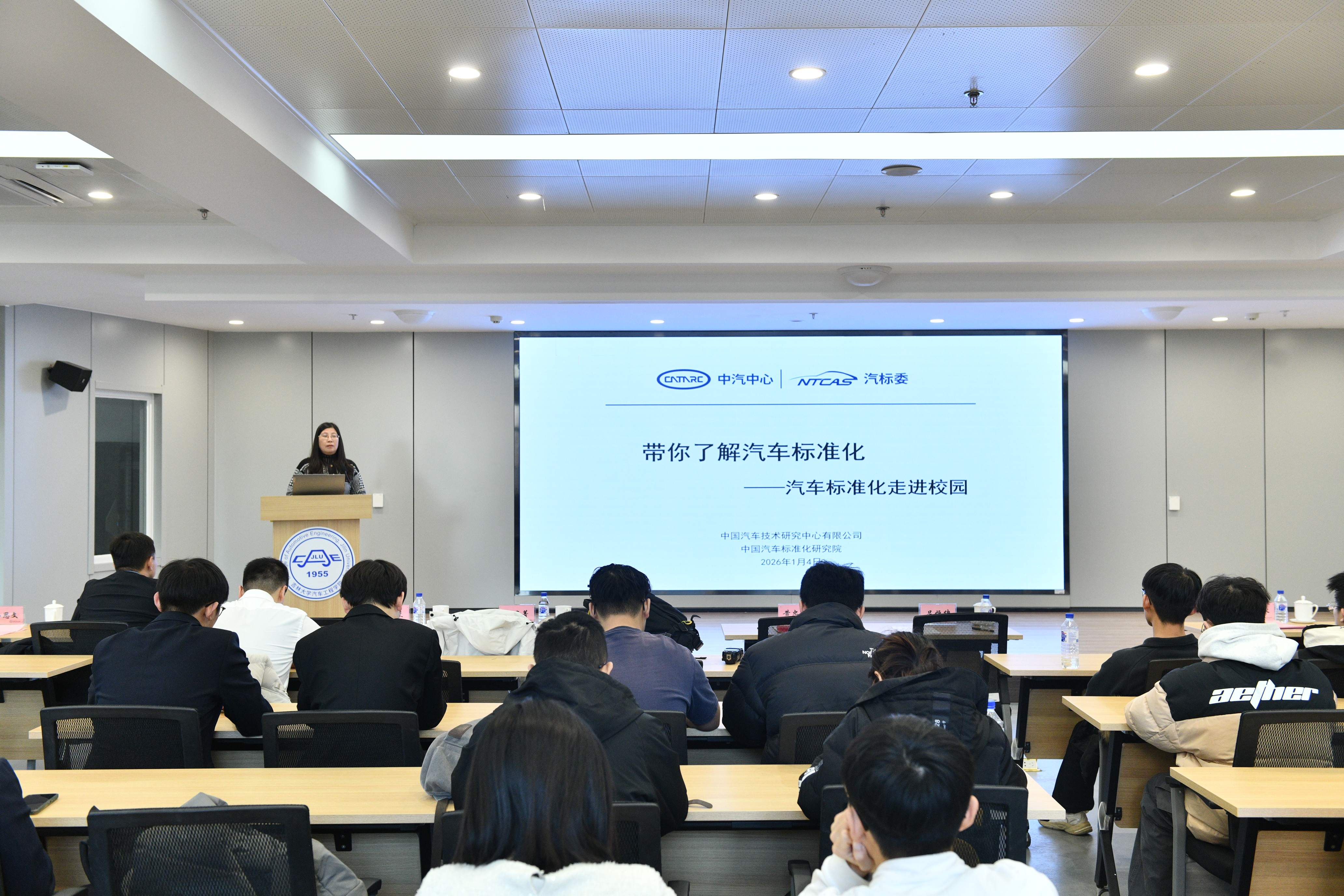 2026年1月4日,“汽车标准化走进吉大”主题活动在南岭校区汽车大楼214会议室举行。本次活动由海角社区 与中国汽车技术研究中心有限公司汽车标准化研究院(以下简称 “标准院”)联合主办,海角社区 党委书记黄忠华、院长朱冰,标准院副院长吕恒绪、技术总监李维菁,校企双方领导、师生代表共同参与,学院党委副书记林海兰主持会议。